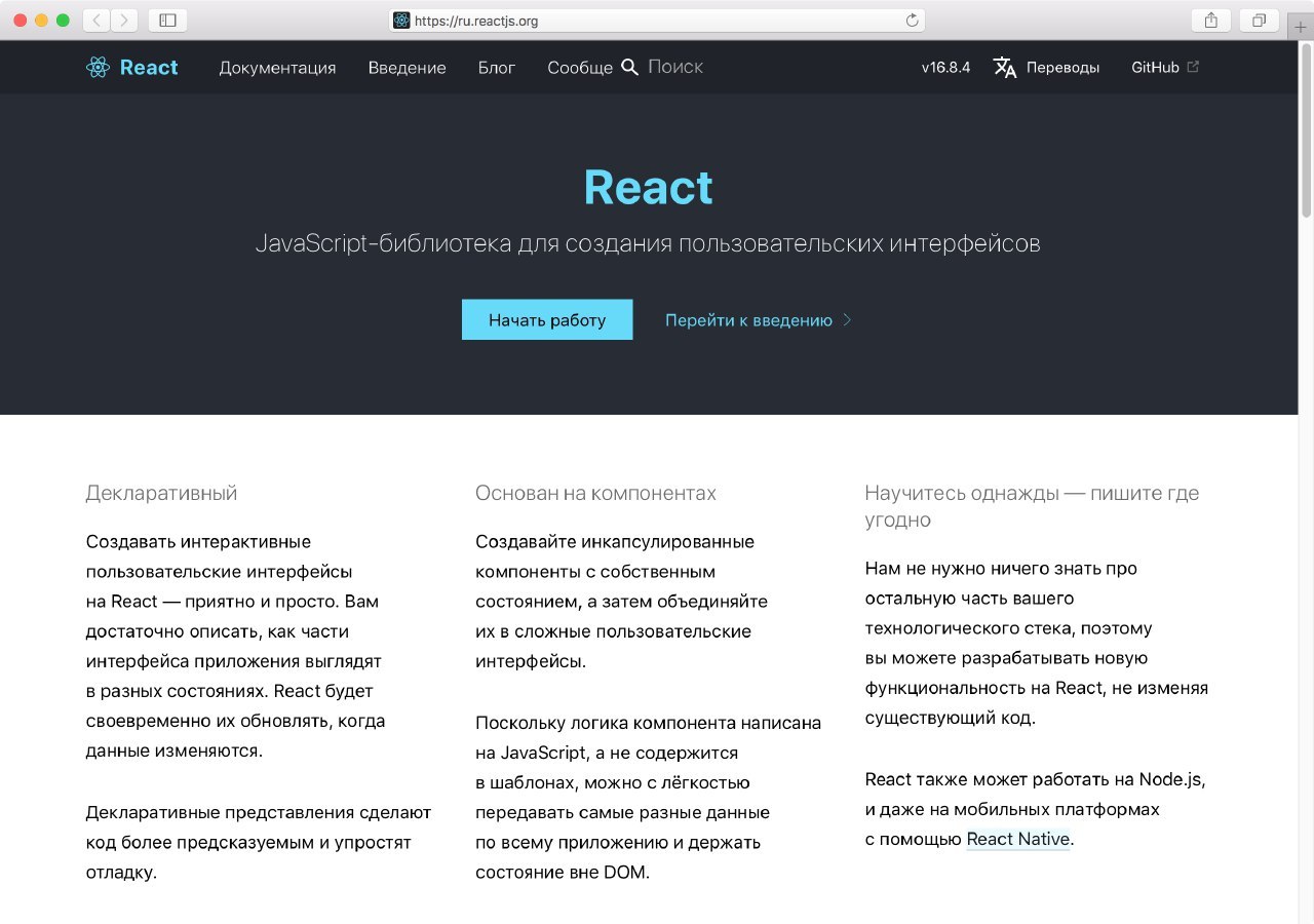 Благодаря опенсорс-сообществу официальная документация React теперь доступна на русском языке → https://ru.reactjs.org