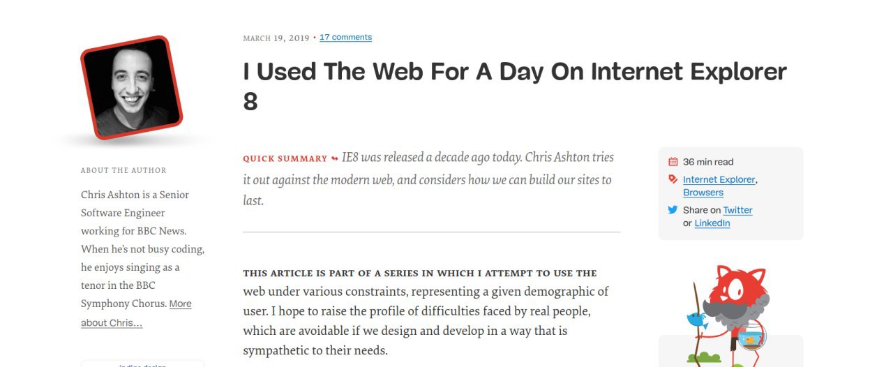 I Used The Web For A Day On Internet Explorer 8. Занимательный рассказ с множеством картинок об опыте использования ие8 (в течении одного дня). Читая я осознал, насколько я счастлив что есть инструменты типо babel и autoprefixer, позволяющие нам писать фронтенд, используя современные инструменты, не ломая при этом старые браузеры → http://bit.ly/2UjV0eA