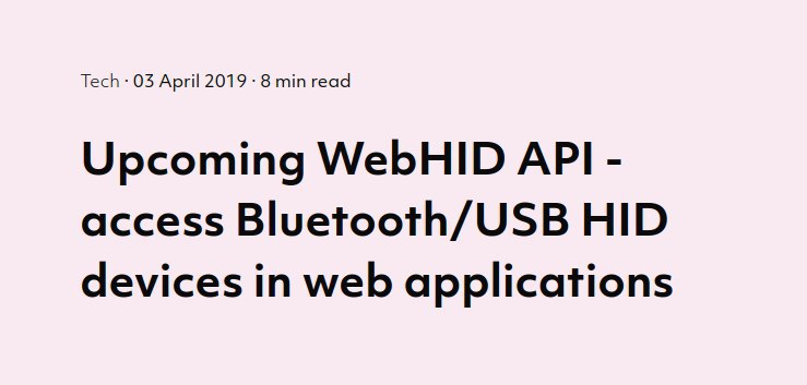 Upcoming WebHID API - access Bluetooth/USB HID devices in web applications. Хочется верить, что мы движемся в эпоху кросс-платформенных приложений. И что радует, скорее всего они будут базироваться на основе современных браузеров. Очень интересная статья, рекомендую ознакомиться → http://bit.ly/2P4HMwl