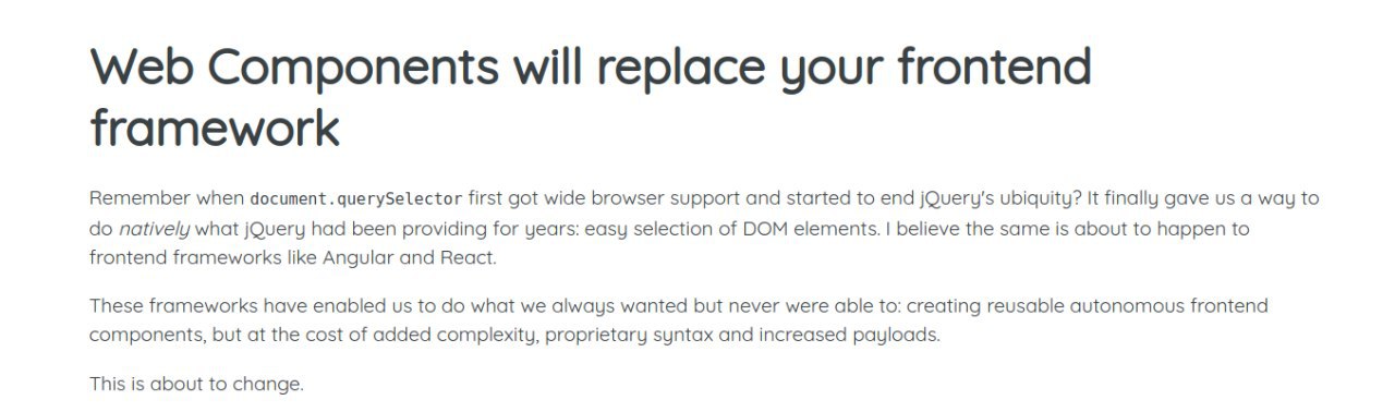 Web Components will replace your frontend framework. Крутейшая статья о том, что такое веб-компоненты, как ими пользоваться и почему они смогут заменить фреймворки. Думаю что за веб-компонентами будущее веба, но говорить что они скоро заменят фреймворки я бы не стал. В общем, почитайте → http://bit.ly/2WXZ2pN