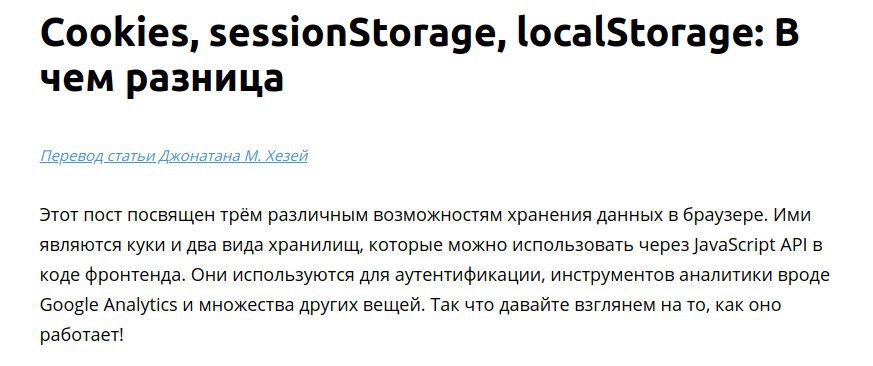 Cookies, sessionStorage, localStorage: В чем разница. Познавательный пост о том, в чем заключаются отличия между разными видами web storage и в каких случаях лучше использовать каждый из них → http://bit.ly/2WKDCkg