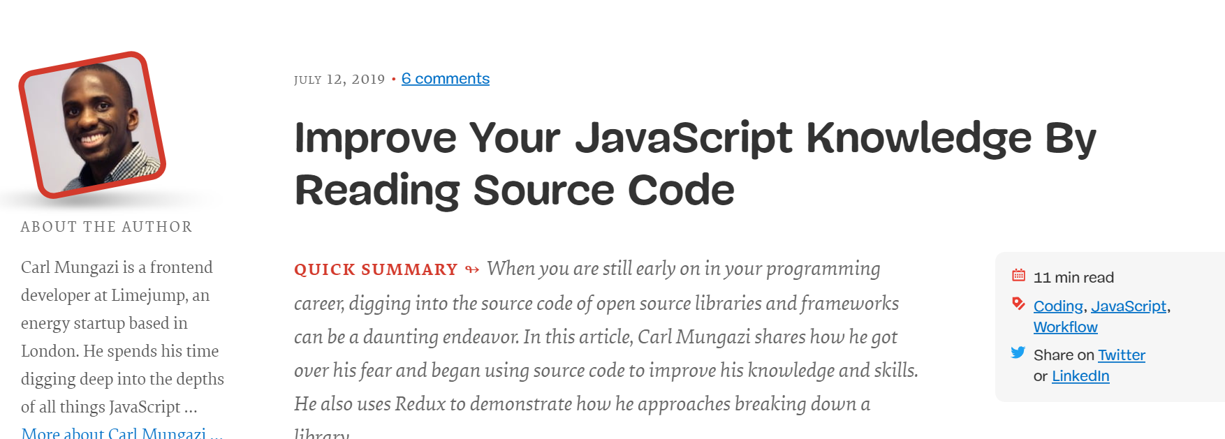 Improve Your JavaScript Knowledge By Reading Source Code. Статья-размышление о том, как улучшить знания js, читая исходники популярных библиотек → http://bit.ly/2M2Blua