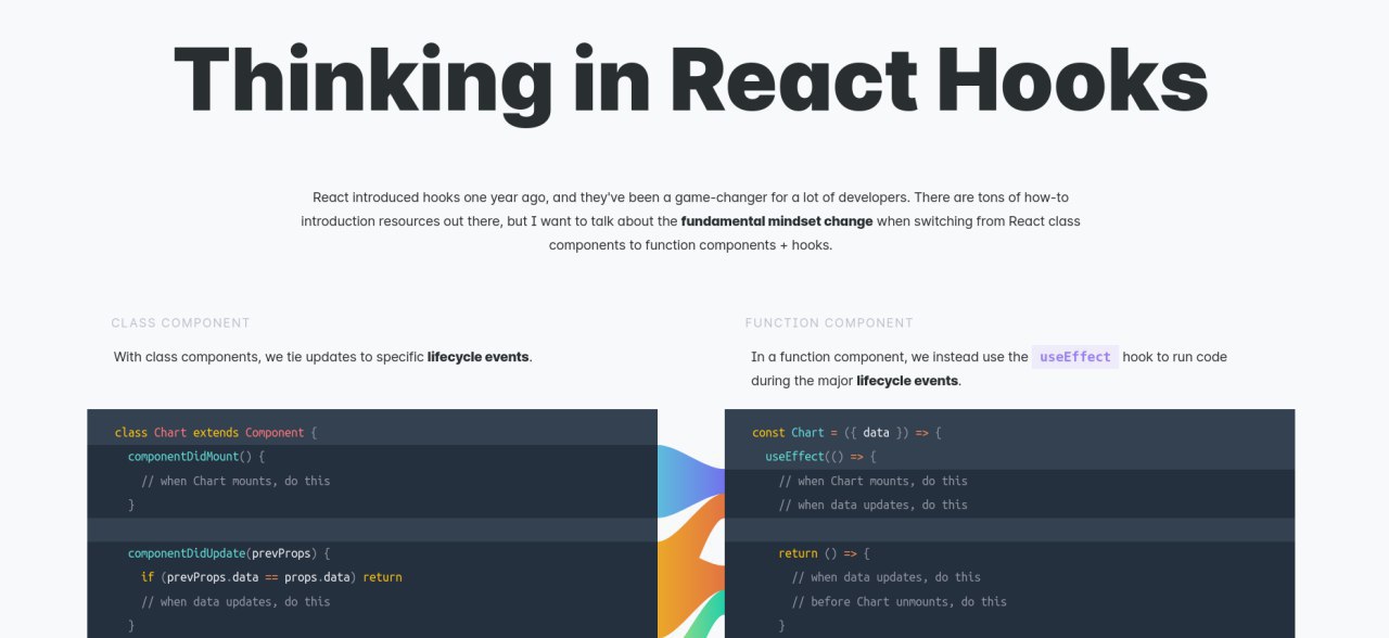 Thinking in React Hooks. Хорошая статья, в которой на красивых примерах показывается разница в использовании компонентов-классов и хуков → http://bit.ly/398y7hQ