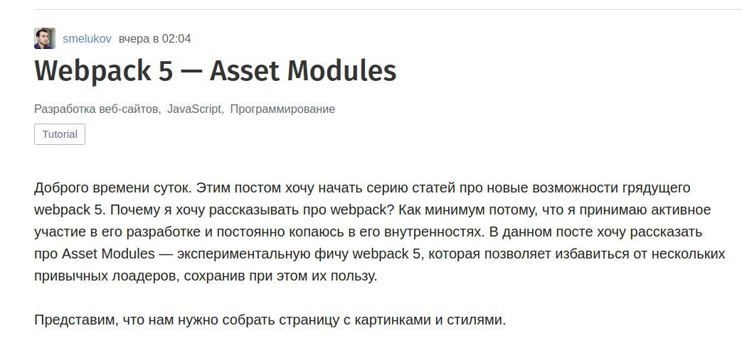 Webpack 5 — Asset Modules. Рассказ об экспериментальной фиче нового вебпак от члена core-тимы → http://bit.ly/38DUkE0