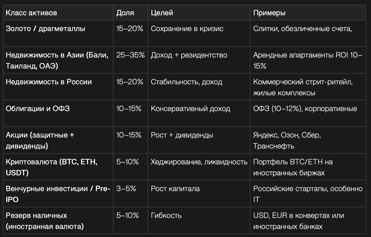 ✔️ Весомую долю занимают недвижимость и драгметаллы (до 20% на каждый актив). К слову, ИИ предупреждает о возможном падении золота на 20% при завершении СВО.