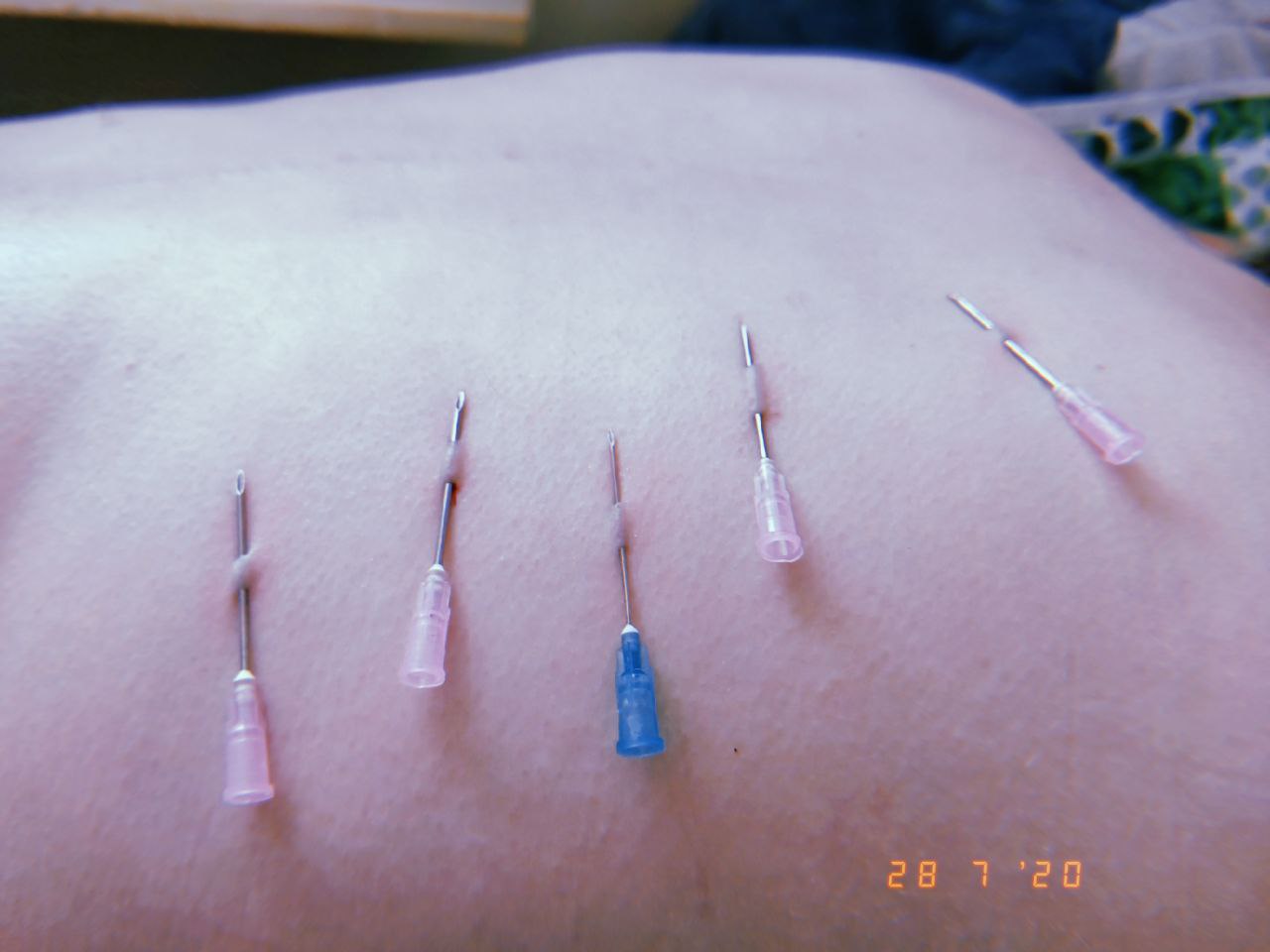 Это было по-другому. Может быть, из-за того, что в этот раз местом выбрали спину, точнее, участок ближе к плечу. Во-вторых, так уж вышло, что иглы у нас остались почти все 1.2 мм по толщине иглы, что тоже повлияло на ощущения. Кстати, ожидания вообще не оправдались, я думала, что более толстыми будет больнее, а оказалось наоборот. Толстые не так ныли в коже, это была приятная боль.