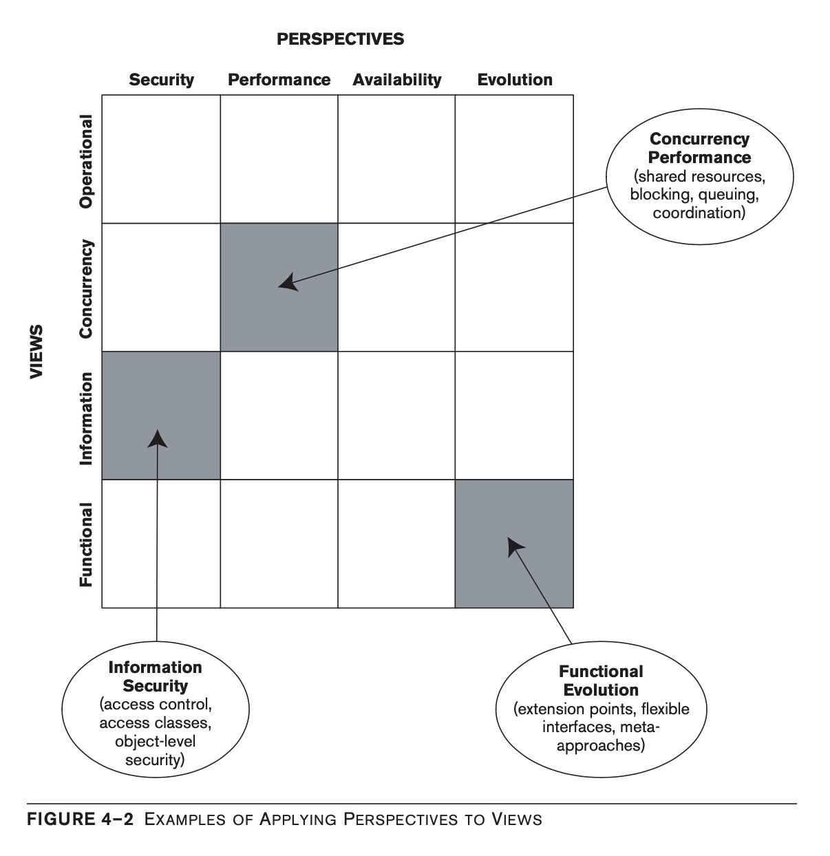 3. Perspective (архитектурные перспективы) это аналог представлений, но используются они для того чтобы описать «как» должна работать система. Обычно через представления описываются вопросы относящиеся к качественным характеристикам – безопасность, надежность, производительность. Перспективы могут быть общими для многих представлений.
