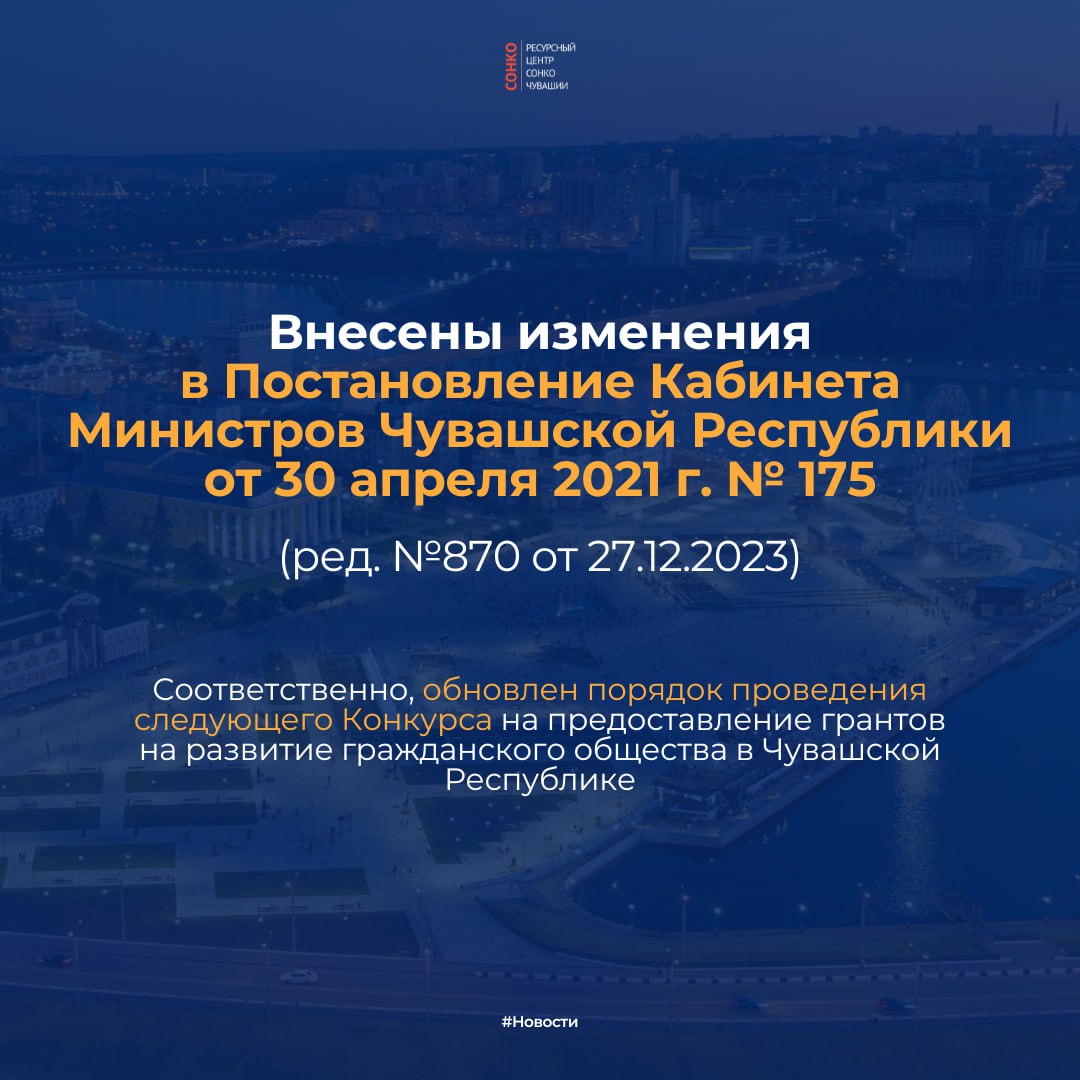 ⚡️Обновлено Постановление Кабинета Министров Чувашской Республики от 30 апреля 2021 г. № 175, регулирующее проведение Конкурса на предоставление грантов на развитие гражданского общества в Чувашской Республике