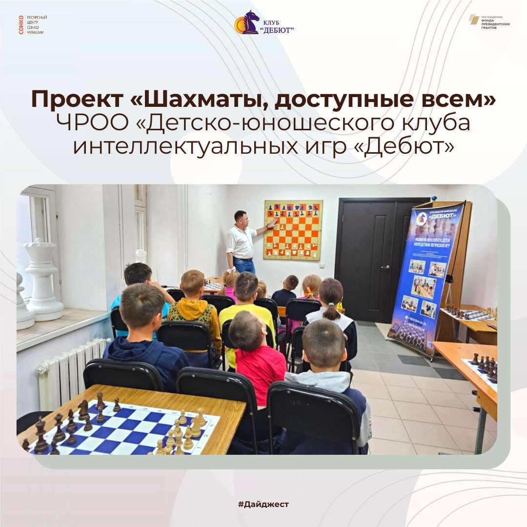 ⚡️Проект «Шахматы, доступные всем» ЧРОО «Детско-юношеского клуба интеллектуальных игр «Дебют» стал победителем конкурса Фонда президентских грантов и министерства экономического развития Чувашской республики. Дети из малоимущих, многодетных семей, дети с ОВЗ получили возможность бесплатно обучаться шахматам.