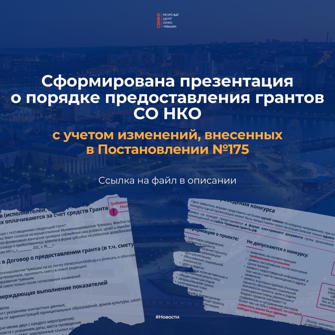 ⚡️Сформирована презентация о порядке предоставления грантов СО НКО из бюджета Чувашии и ФПГ с учетом изменений, внесенных в Постановление №175