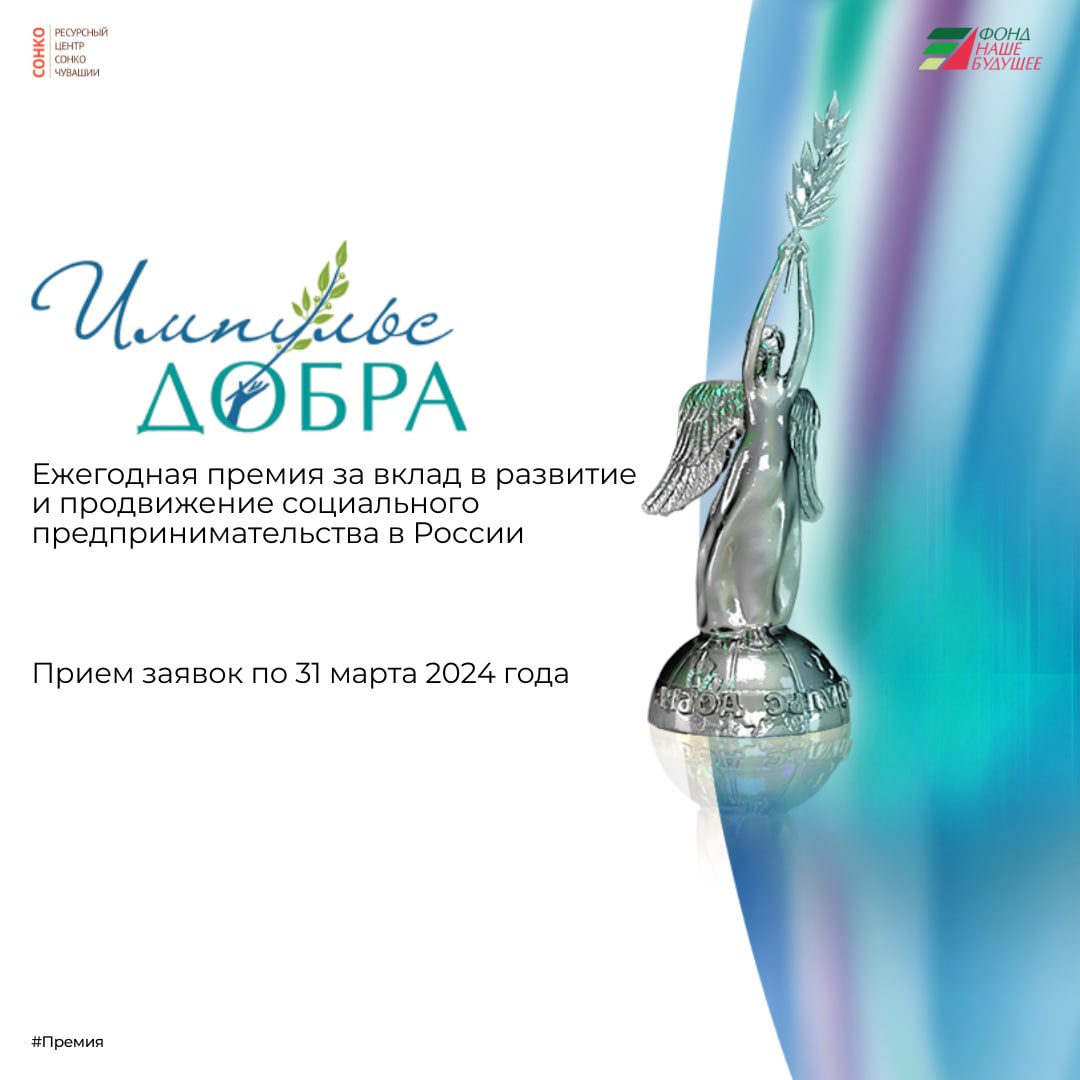 💭«ИМПУЛЬС ДОБРА» – ежегодная Премия за вклад в развитие и продвижение социального предпринимательства в России, учрежденная Фондом региональных социальных программ «Наше будущее». Премия присуждается социальным предпринимателям, представителям общественных организаций, руководителям государственных структур и профильных ведомств, журналистам, СМИ и высшим учебным заведениям России.