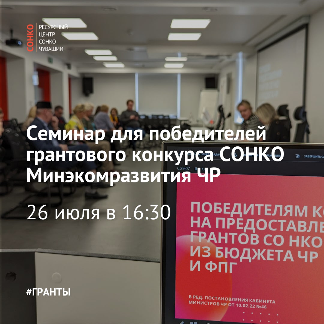 📅Завтра в 16:30 на базе Ресурсного центра (по адресу: просп. Ленина 12Б, 1 этаж, конференц зал) состоится семинар для победителей Конкурса на предоставление грантов в форме субсидий на развитие гражданского общества некоммерческим неправительственным организациям, осуществляющим деятельность на территории Чувашской Республики, в 2022 году.