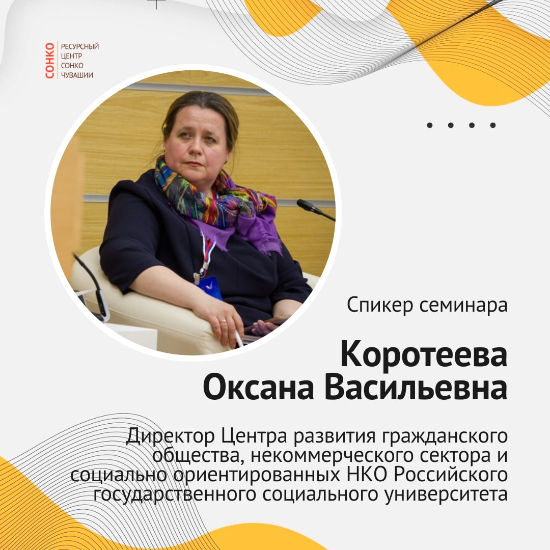 💭Спикеры семинара: директор Центра развития гражданского общества, некоммерческого сектора и социально ориентированных НКО Российского государственного социального университета Коротеева Оксана Васильевна, эксперты Минтруда Чувашии, Управления Минюста России по Чувашской Республике.