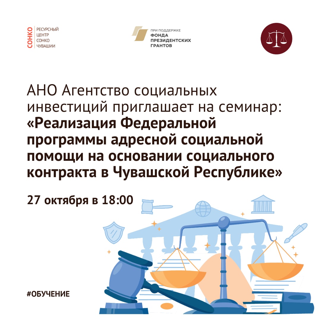 ⚡️ В рамках проекта «ВАШ ЮРИСТ 2.0», который реализуется за счёт средств Фонда президентских грантов, состоится семинар на тему: «Реализация Федеральной программы адресной социальной помощи на основании социального контракта в Чувашской Республике».