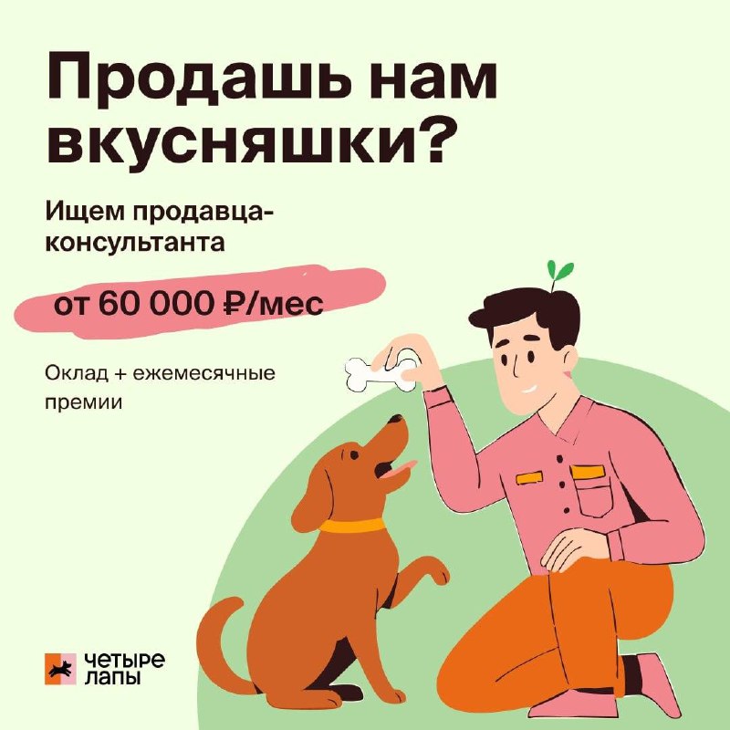 Известный бренд «Четыре лапы» приглашает в магазины Продавцов-консультантов.✌️