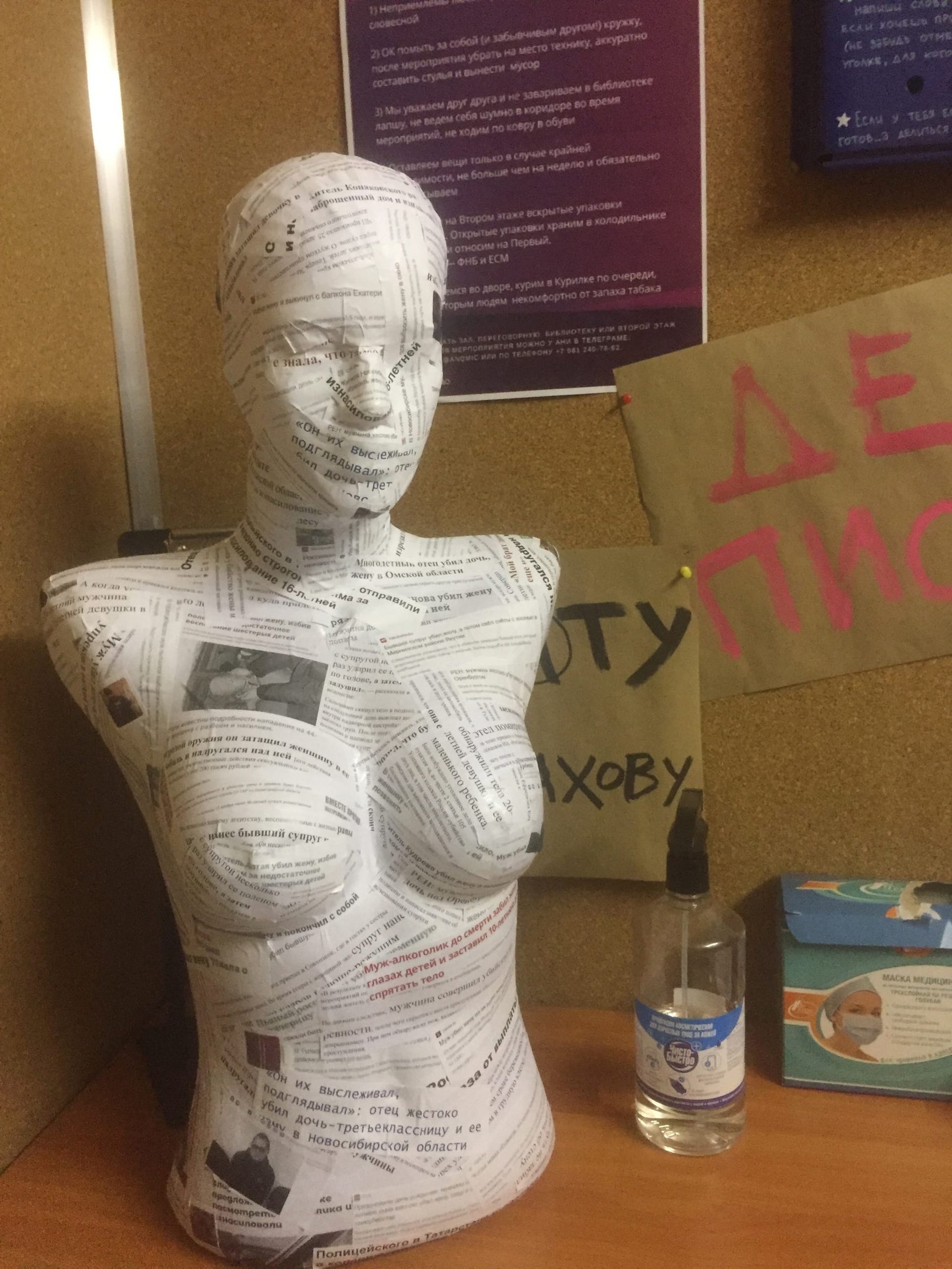Именно в этот памятный день, 25 ноября активисток Марину Сингх, Полину Титову, Лёлю Нордик и Марину Ширяеву задержала полиция за то, что они сделали мемориальную акцию памяти женщинам, пострадавшим и погибшим в результате насилия. Активистки создали скульптуру, обклеенную вырезками из газет, с новостями о случаях насилия. Установили ее как памятник в небольшом сквере у фонарного моста, зажгли свечи, прочитали вслух свой небольшой манифест о проблеме насилия над женщинами, сфотографировали эту инсталляцию и разошлись.