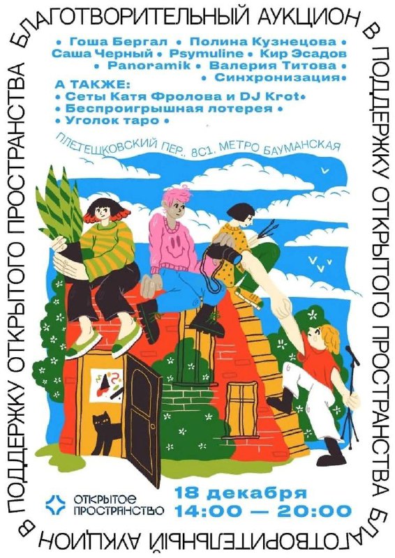 К поддержке Открытого пространства присоединились художники, фотографы и дружественные инициативы, чьи работы и идеи нам близки. Аукцион пройдет в гибридном формате: и офлайн, и онлайн — в телеграме Открытого пространства. В поддержку Пространства будет перечислена половина собранных средств.