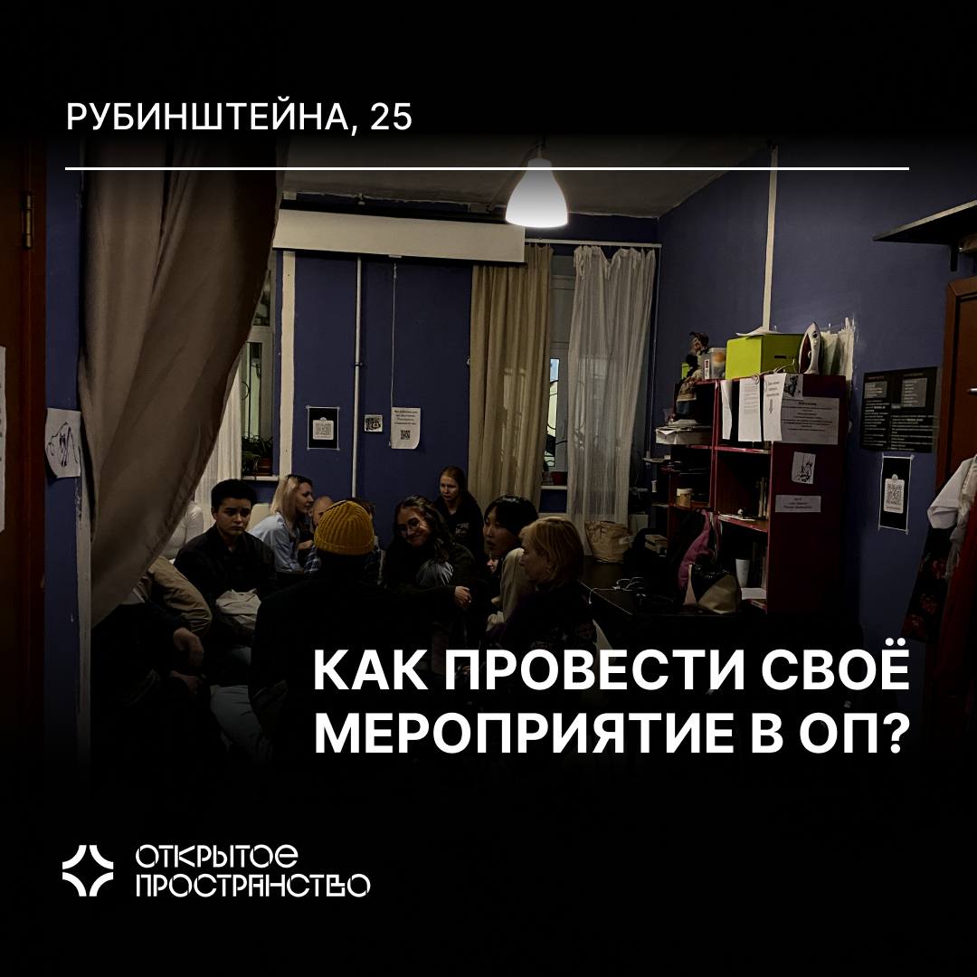 Вы можете провести свою встречу на площадке Открытого пространства. Бесплатно. Если вы хотите организовать мероприятие в ОП, обращайтесь в телеграм @OpenSpaceSPb_bot