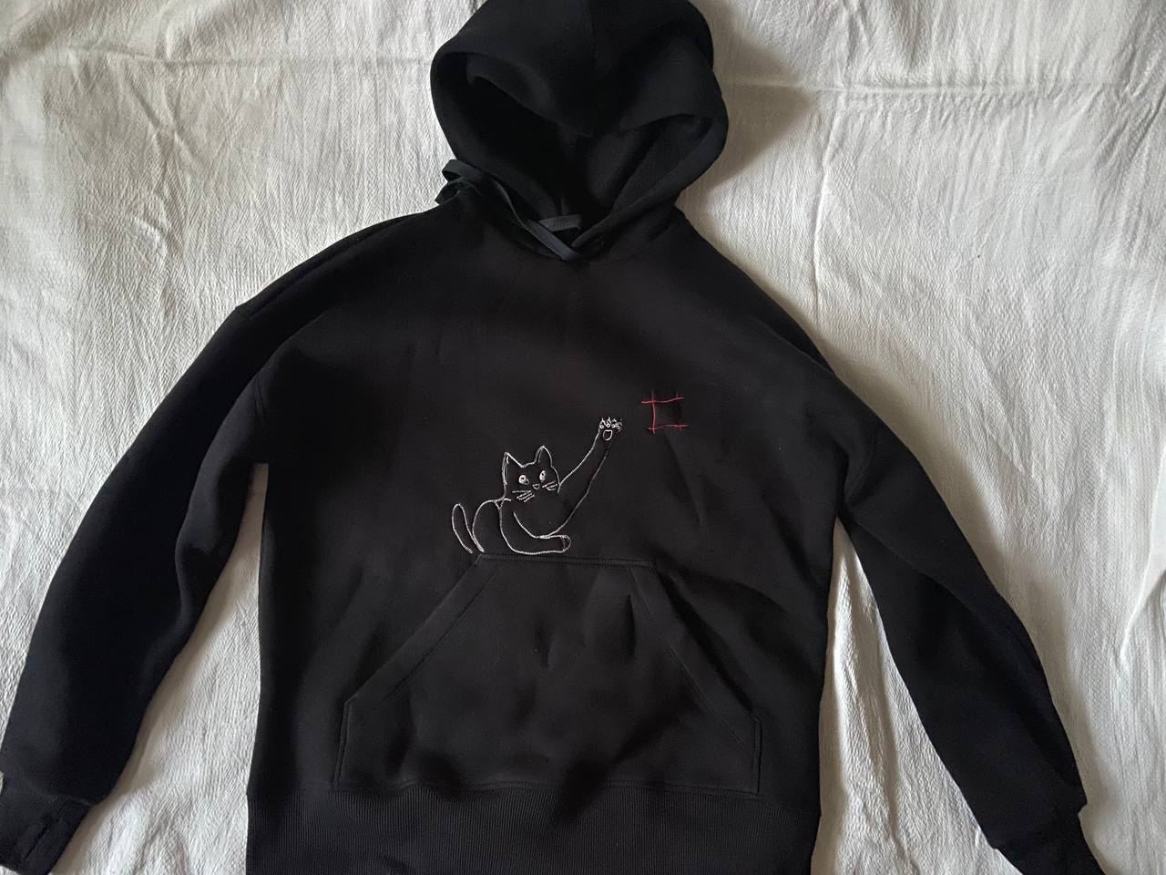 Рисунок на толстовке повторяет рисунок кота, играющего с Репрессией, который Паша вышил на своем худи к одному из судов в рамках второго круга рассмотрения его дела. Вот что он сам пишет об этом: