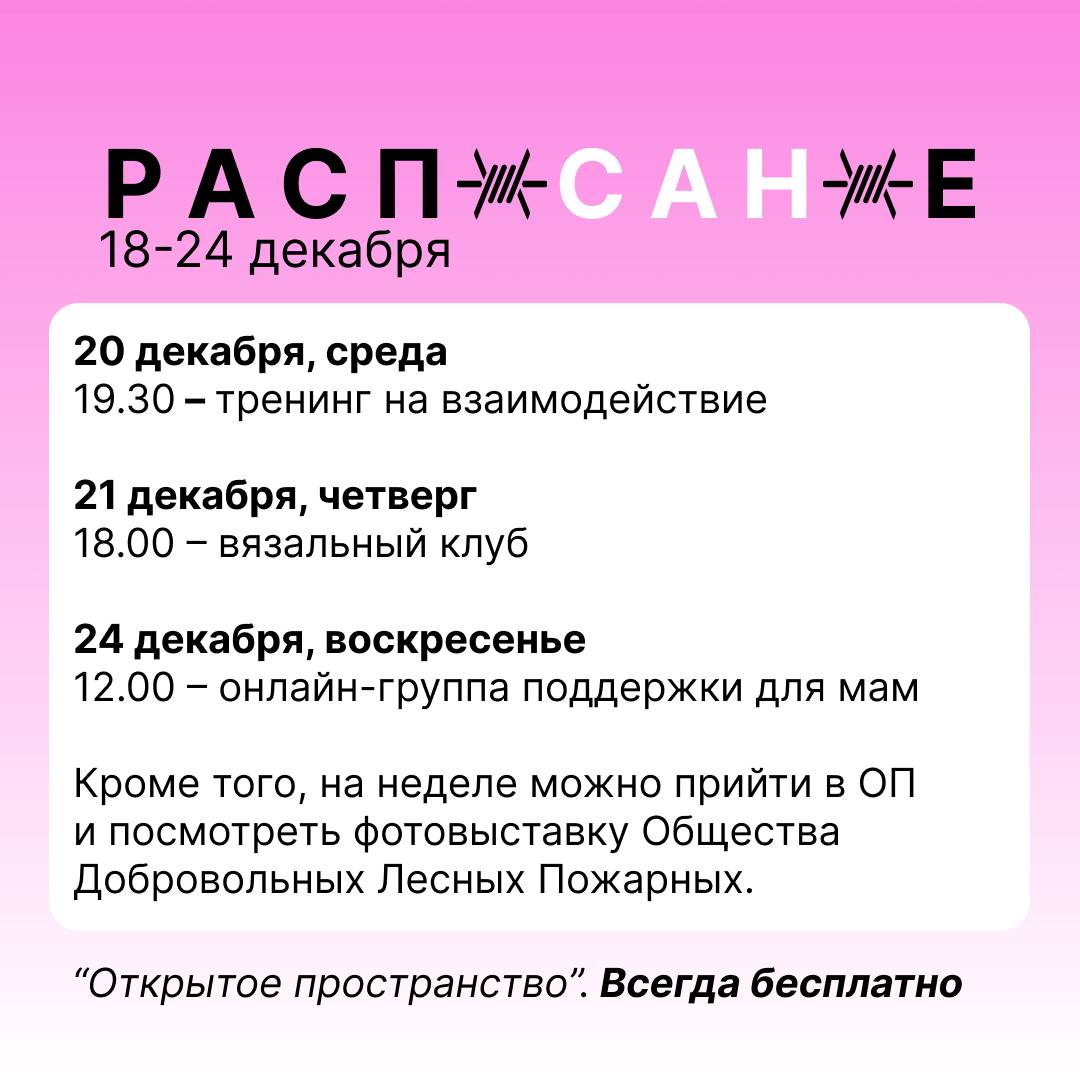 Приготовили расписание открытых мероприятий в пространстве на неделю. Вы можете прийти на любую из этих встреч.
