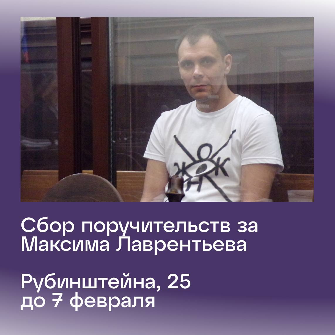 Мы просим вас поддержать Максима поручительствами. Следующее судебное заседание по мере пресечения состоится 13 февраля. Прийти к нам на Рубинштейна, 25 и подписать поручительство можно сегодня и завтра с 15:00 до 22:00