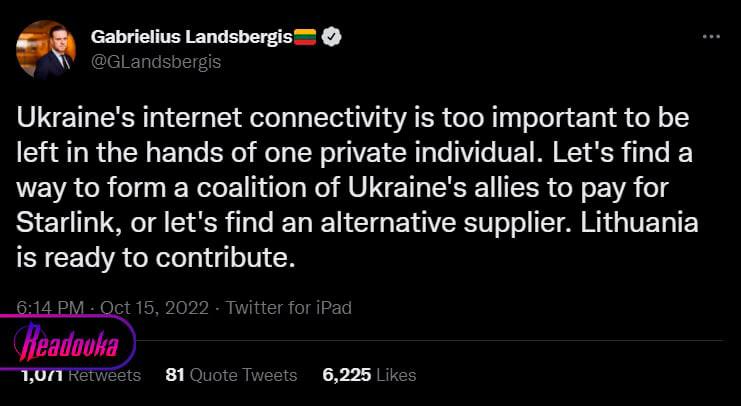 Ранее к попрошайничеству присоединился еще и глава литовского МИД, предложив союзникам Украины оплатить незалежной спутниковый интернет Starlink.