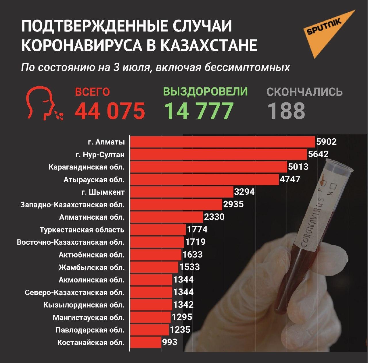 По данным на 2 июля, в Казахстане зарегистрировано 42 574 заболевших КВИ, 14 777 выздоровели, 188 погибли.