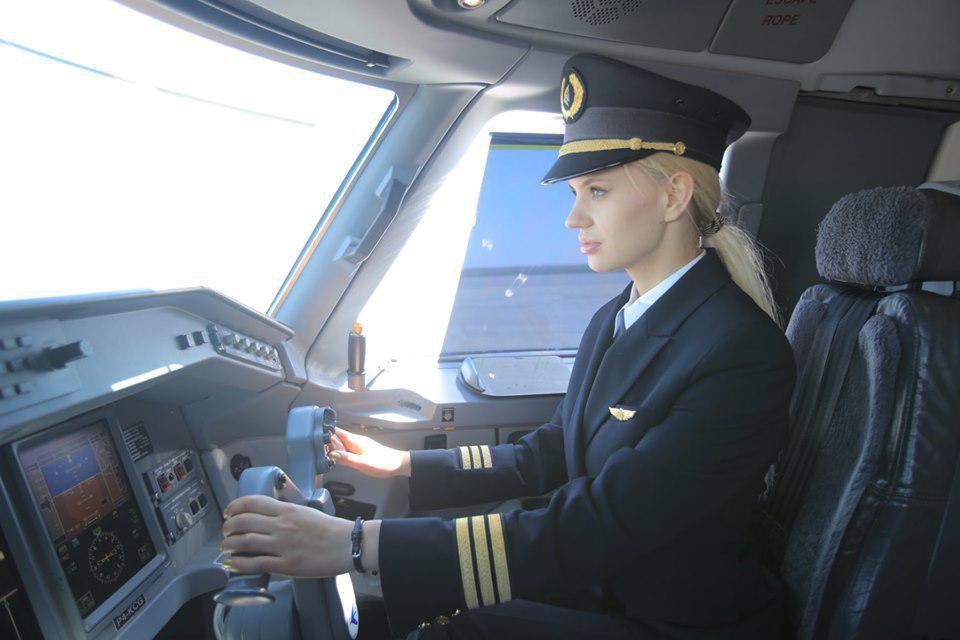Блондинка с голубыми глазами управляет самолетом Embraer.