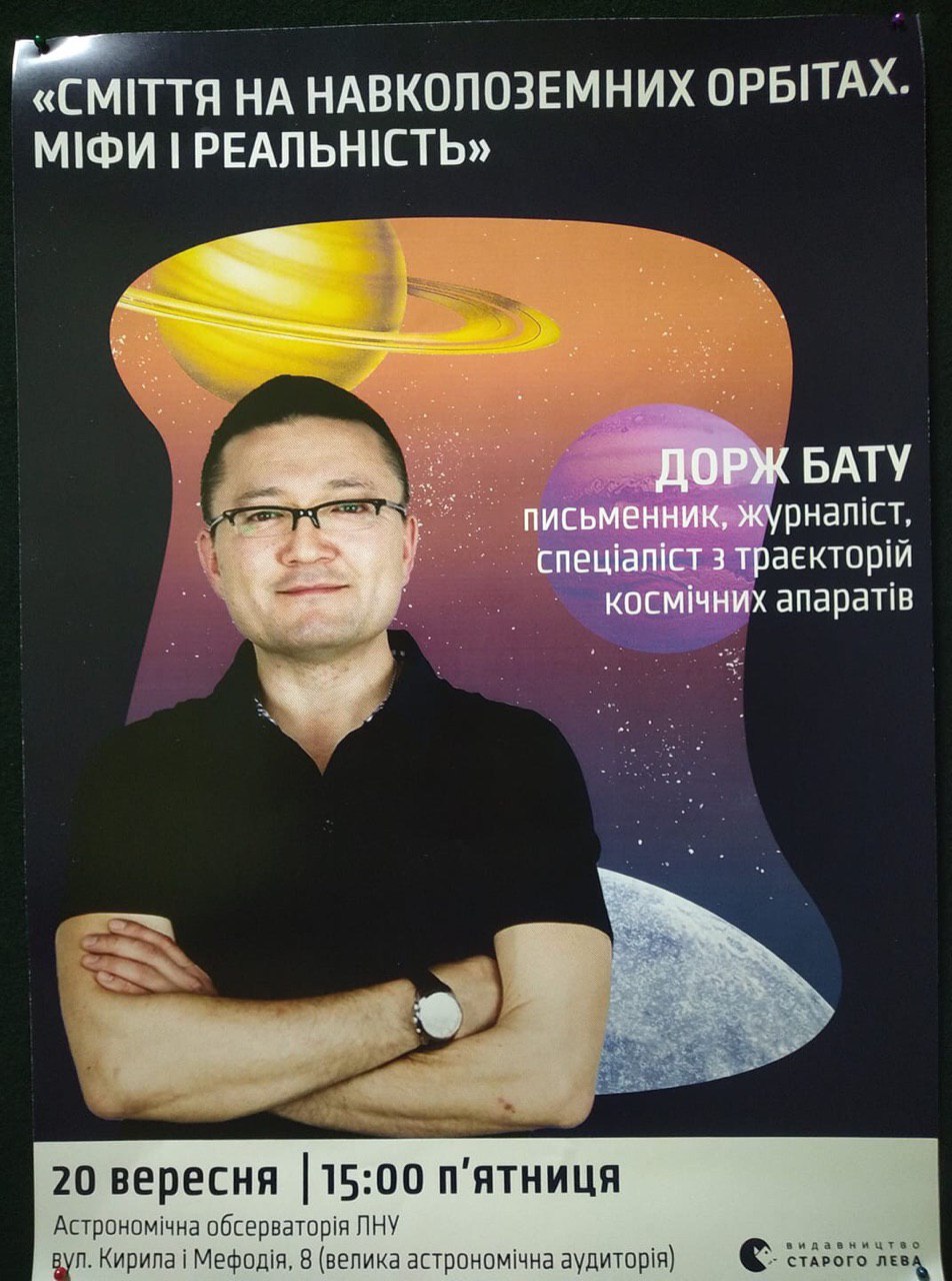 В цю п'ятницю (20 вересня), о 15:00, у Великій астрономічній аудиторії відбудеться зустріч із українським письменником та співпрацівником NASA Доржем Бату, автором книг "Франческа. Повелителька траекторій" та "Франческа. Повелителька офіцерського жетона". На зустрічі буде обговорюватись проблема космічного сміття. Запрошуються усі.