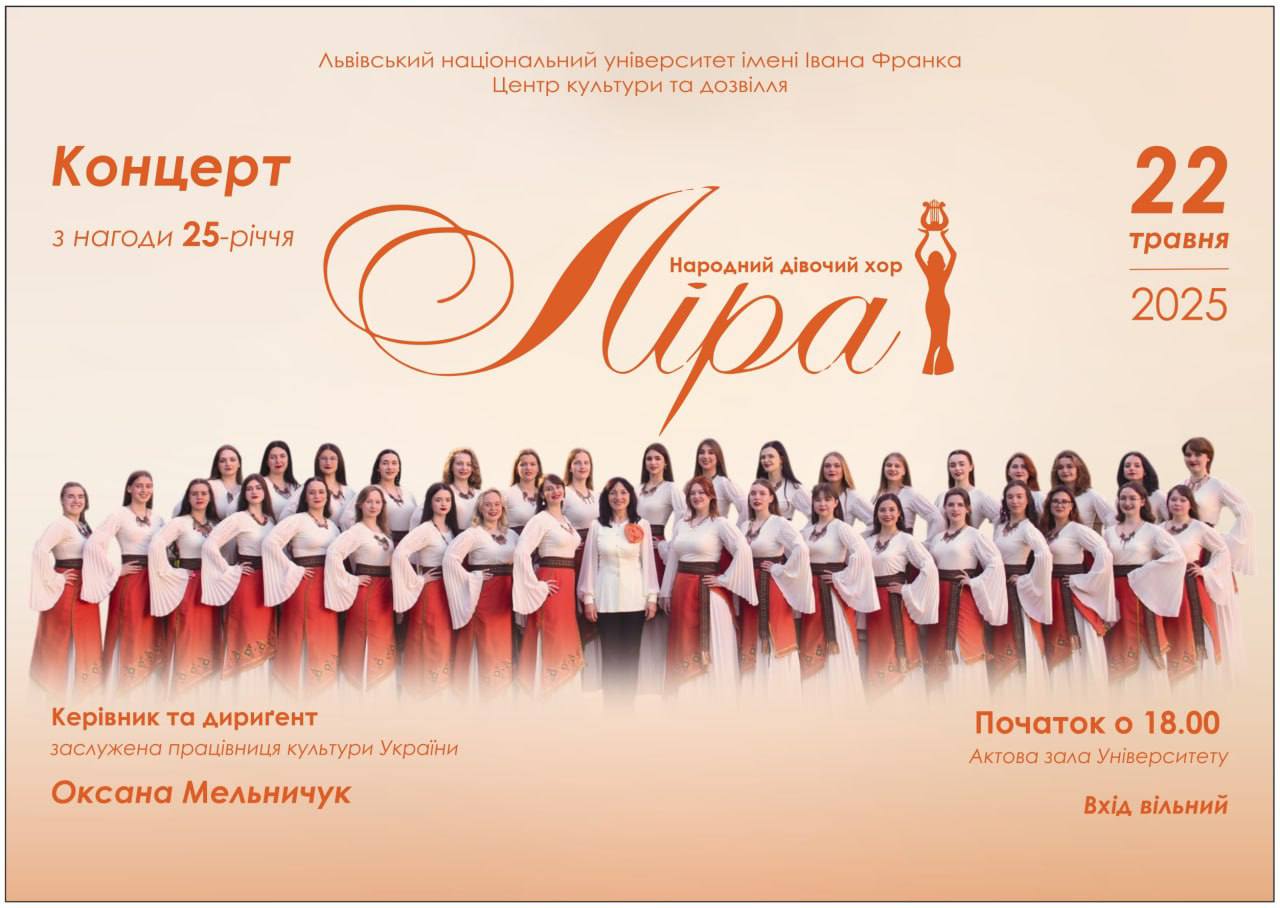 🎶Запрошуємо академічну спільноту Університету та всіх поціновувачів хорового мистецтва на святковий концерт, присвячений 25-річчю творчого шляху Народного дівочого хору «Ліра» Львівського національного університету імені Івана Франка під керівництвом Оксани Мельничук.