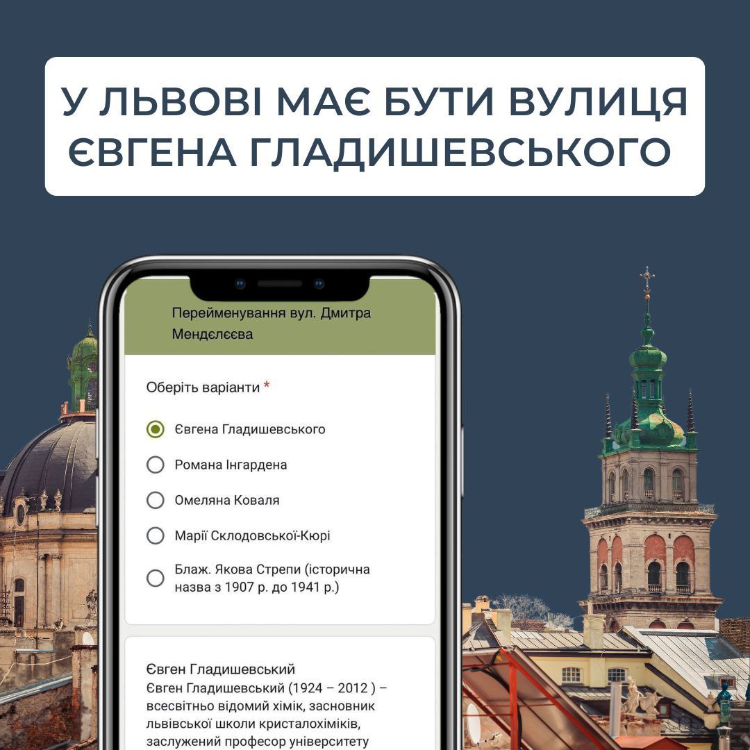 ✅ Просимо підтримати ініціативу хімічного факультету щодо перейменування вулиці Дмитра Менделєєва на вулицю Євгена Гладишевського, всесвітньо відомого хіміка, засновника Львівської кристалохімічної школи, заслуженого професора Університету!