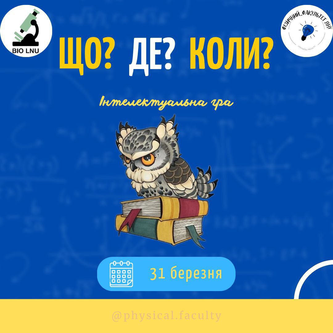 Студенти та викладачі, запрошуємо вас на нашу наступну гру "Що? Де? Коли?", яка відбудеться в нашому університеті вже 31 березня!