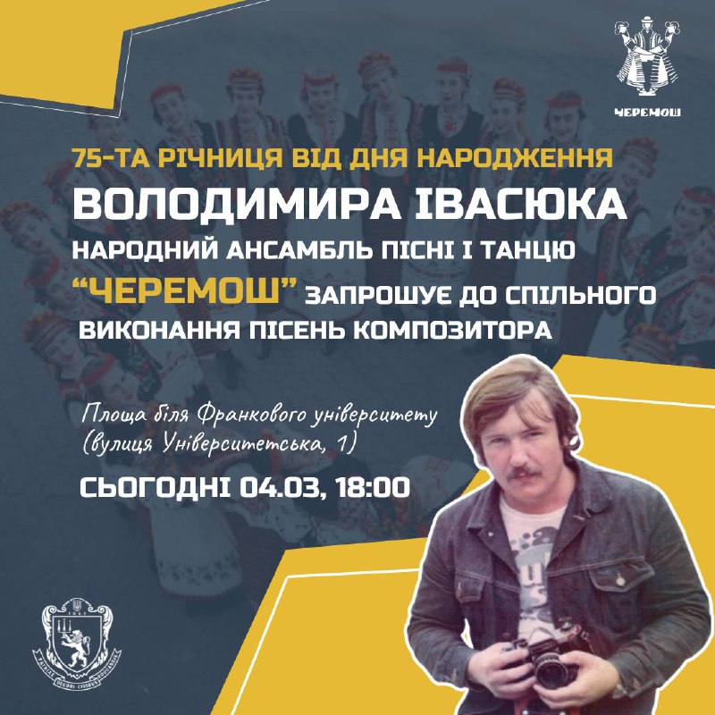 Сьогодні, 4 березня, з нагоди 75-ї річниці від Дня народження українського композитора-виконавця, музиканта, мультиінструменталіста та поета Володимира Івасюка, народний ансамбль пісні і танцю «Черемош» запрошує до спільного виконання пісень композитора.