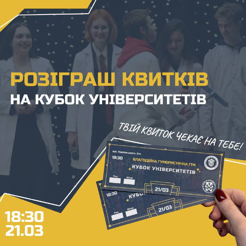 Хочемо потішити вас приємною новиною: розігруємо квиточки на Благодійну гумористичну гру «Кубок університетів» 🫶