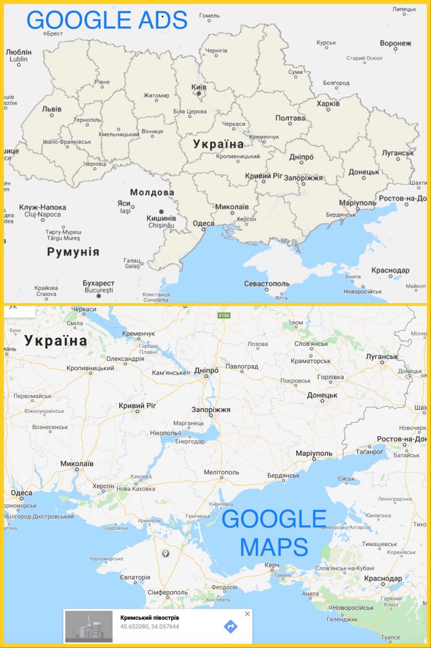 При налаштуванні реклами для YouTube (так, це про відео #шарійсцикун, як і обіцяв) через сервіс Google Ads, то мапа України показується без Криму як її частини. І хоча там не написано "росія", у користувача може скластись враження що півострів віднесено саме до неї