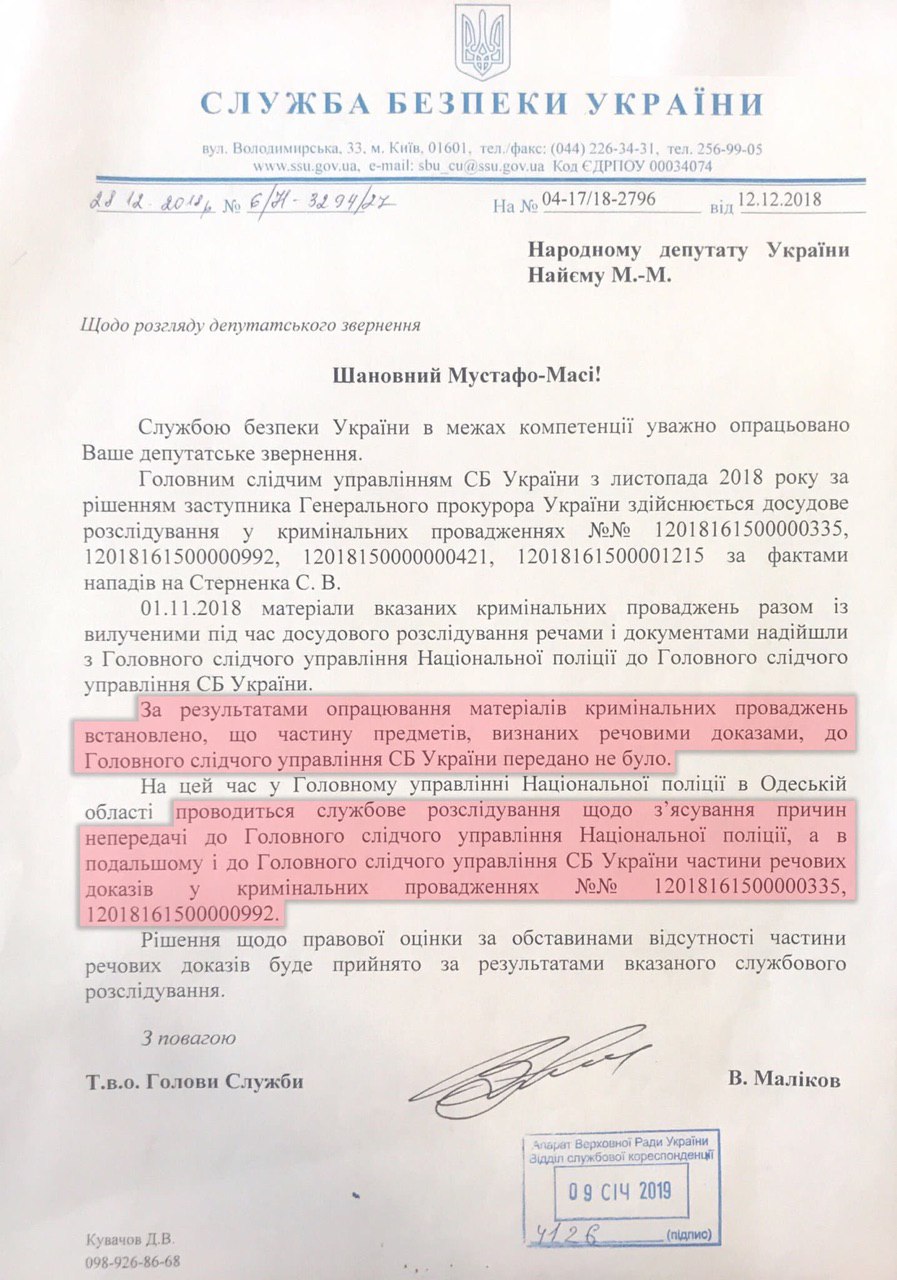 Водночас, нардеп Мустафа Найєм оприлюднив текст офіційної відповіді від СБУ (там зараз розслідують провадження), де підтверджується факт крадіжки речових доказів.