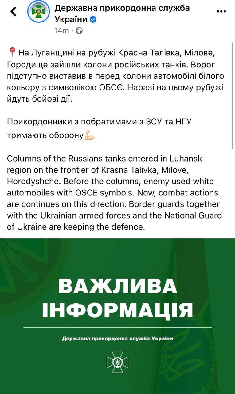 Силами наших військ повернено під повний контроль міста МАРІУПОЛЬ та ЩАСТЯ. Знищено не менше 6 літаків, 2-х вертольотів та десятки одиниць броньованої техніки ворога. В районі Щастя знищено близько 50 російських окупантів.