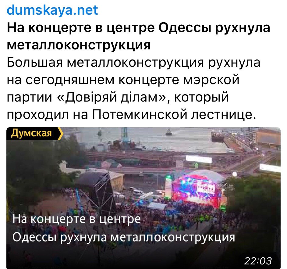 В Одесі на концерті Іри Білик та Макса Барскіх на підтримку Труханова та партії «довіряй ділам» впала металева конструкція. На жаль, Труханов не постраждав.