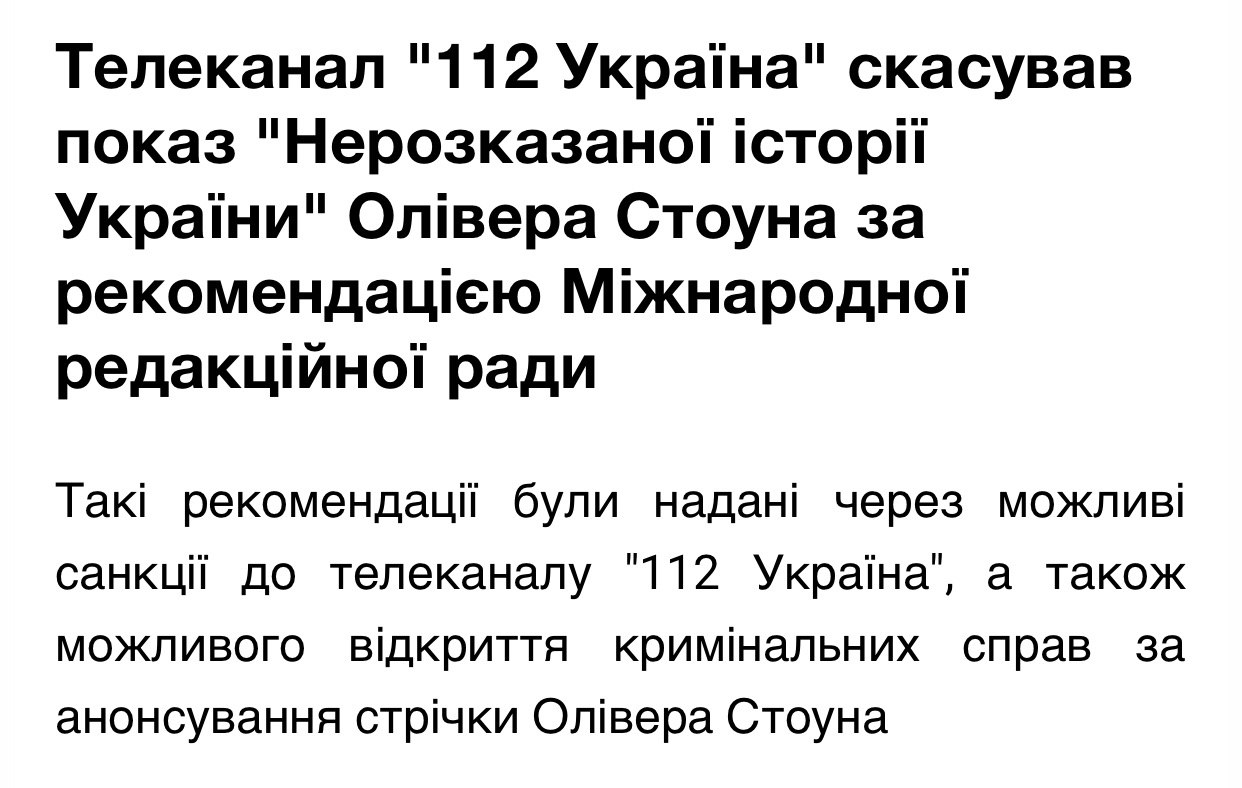 112 канал скасував показ пропагандистського фільму Стоуна «Нерозказана історія України».