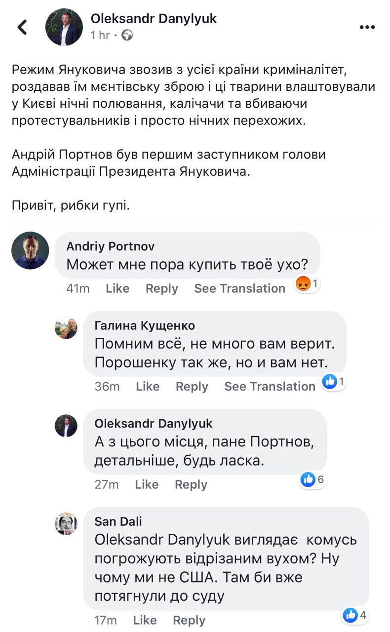 На ньому проросійський регіонал Портнов прямо погрожує Олександру Данилюку, запитуючи чи не пора придбати його вухо.