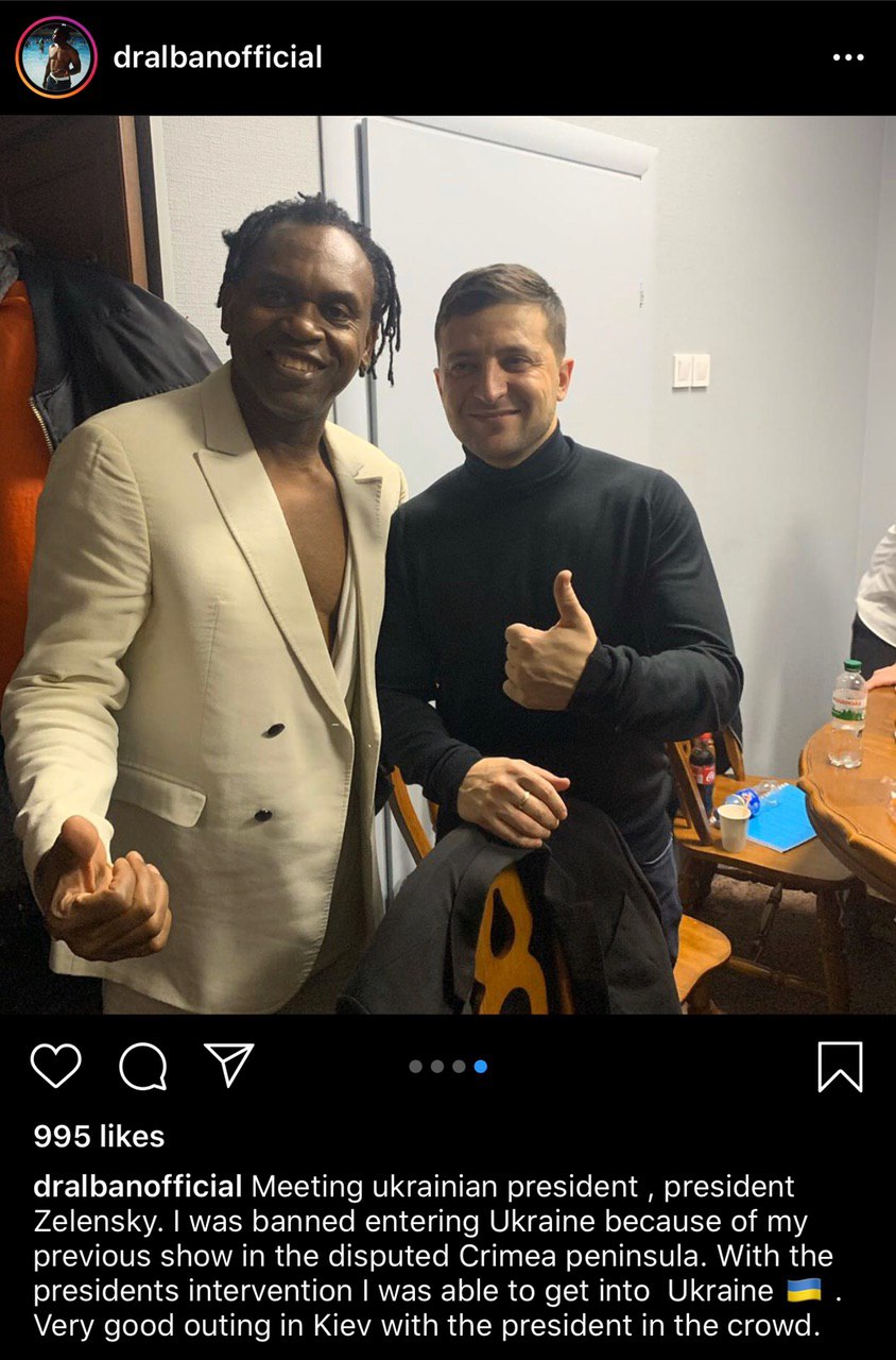 Аж тут це опудало публікує фото з президентом Зеленським, повідомляє що спокійно приїхало в «Kiev» завдяки тому ж Зеленському, та зве Крим «спірною територією».