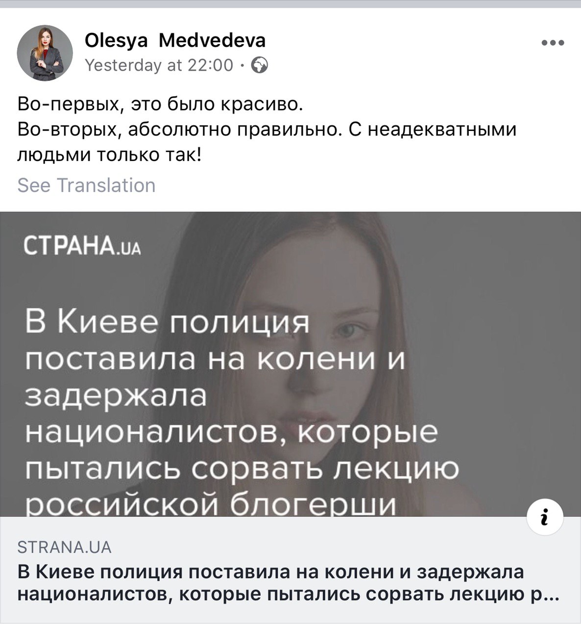 Вона порушила наш закон і мала б отримати заборону на в‘їзд років так на 5, але СБУ та ДПСУ не помітили Сашу, і вона цим скористалась.