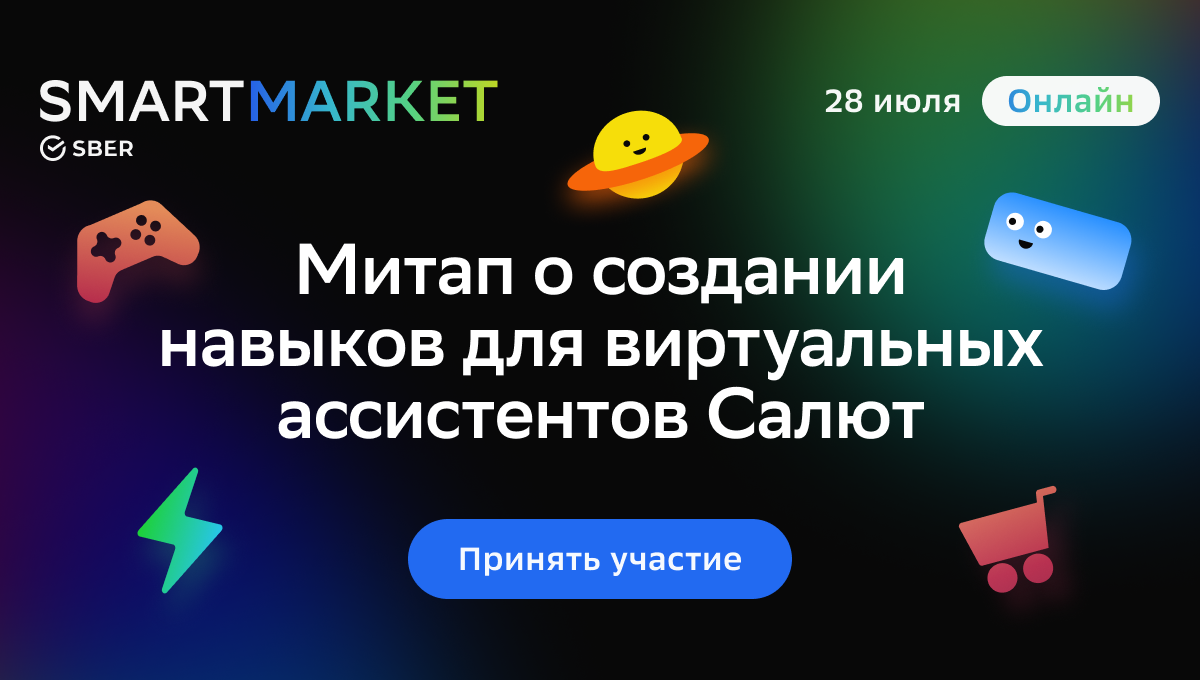 28 июля пройдет онлайн-митап от команды SberDevices, на котором эксперты и разработчики Сбера расскажут о создании навыков для виртуальных ассистентов Салют, голосовых интерфейсах и о том, как быстро создавать уникальные приложения на SmartMarket с помощью готовых шаблонов и зарабатывать на них.