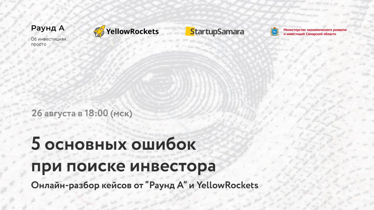26 августа в 18:00 МСК при поддержке StartupSamara для основателей стартапов пройдёт онлайн-разбор кейсов «5 основных ошибок при поиске инвестора» при участии YellowRockets и «Раунд А».
