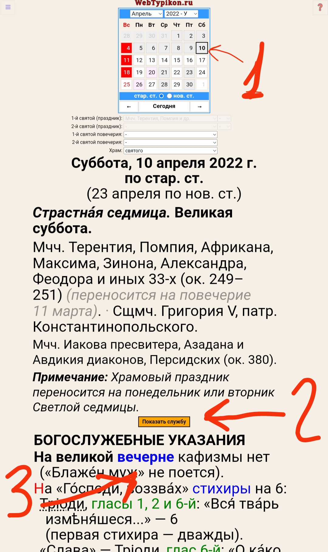 1. В календаре наверху сайта выбрать "10 апреля" (суббота) - потому что календарь по старому стилю, а служба эта относится уже к субботнему дню.