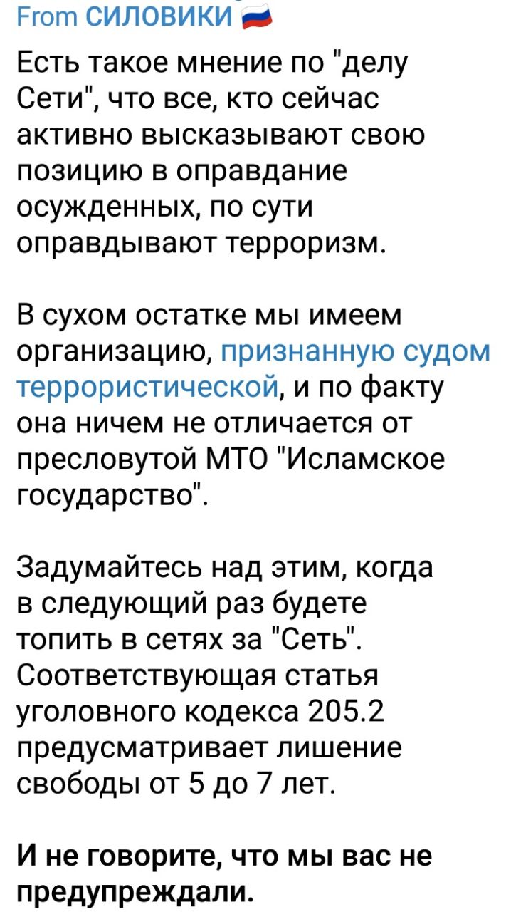 Обратите внимание, насколько нагло и лживо они пытаются уравнять Исламское Государство и Сеть. С одной стороны организация, на счету которой не один теракт и не одно убийство на почве мракобесных религиозных идей. С другой стороны — несколько ребят, под пытками оговорившие себя и оказавшиеся в тюрьме в результате откровенно сфальсифицированного у всех на глазах дела.