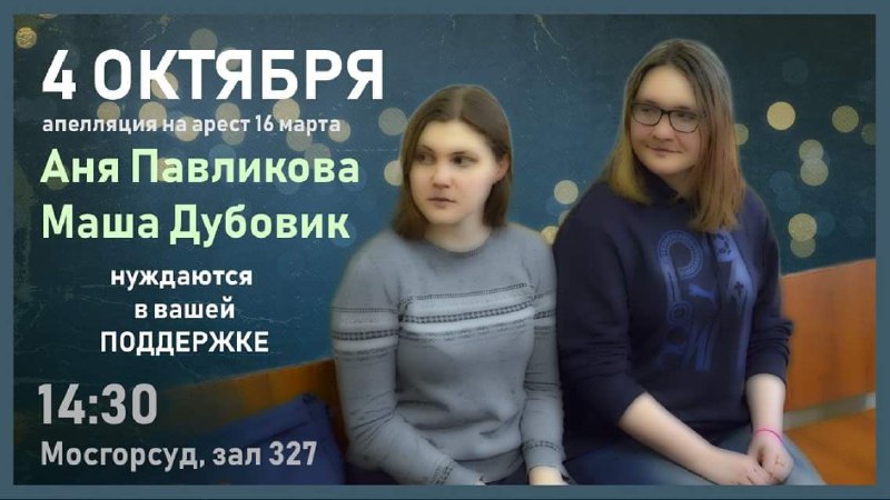 4 октября в 14:30 Московский городской суд снова рассмотрит апелляцию на тот самый арест 16 марта, когда двух девушек и четверых парней поместили в СИЗО, после чего неоднократно продлевали их пребывание там.