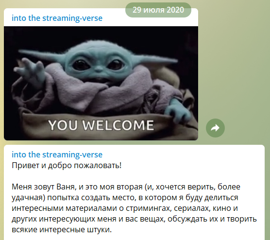 Изначально я задумывал его как место, в котором я буду делиться интересующими меня материалами про стриминги, сериалы и кино, в котором будет несколько моих знакомых, бот и в лучшем случае пара десятков случайных прохожих, которые решат задержаться.