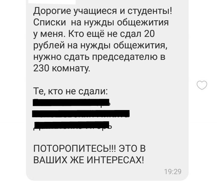 Во 2 общежитии БГАСа со студентов собирают по 20 рублей при выселении. За эти деньги, умноженные на 350 проживающих, их общежитие за столько лет сборов должно быть похоже на неплохой пансионат. Только вот для того, чтобы распечатать заявления старосте приходится ходить и собирать по 20 копеек с каждого.