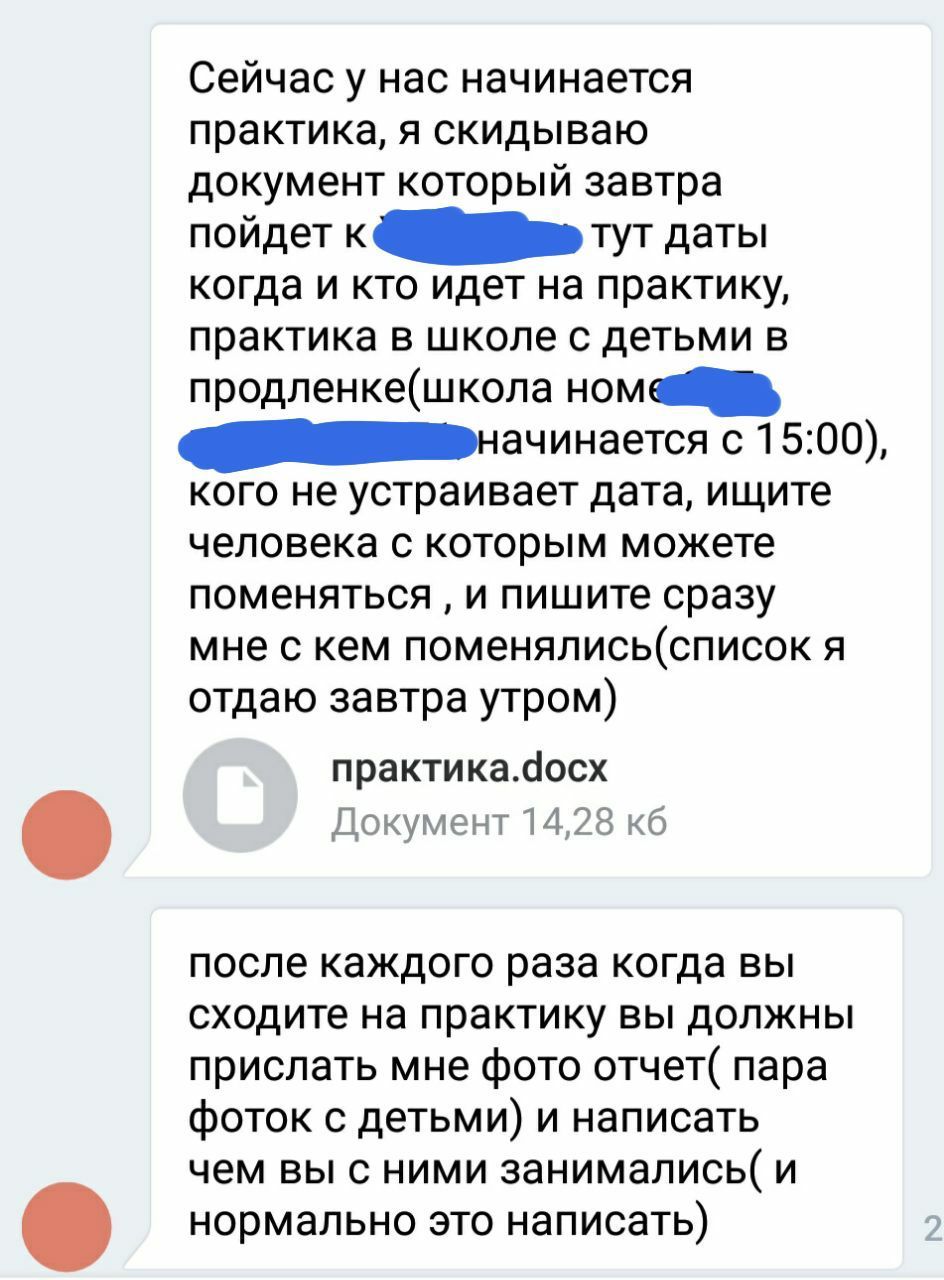 1-ый курс БГПУ отправили неофициально проходить "практику". Смахивает на волонтёрство, но посещение обязательно даже во время пар, в то же время, пропуск пар будет считаться по неуважительной причине. Студентов отправляют в школы, интернаты, изоляторы и т.п. Предупредили за день до начала самой практики, оплачиваться время проведённое там не будет. Дорога от места учебы до места прохождения практики занимает полтора часа на транспорте в одну сторону (учреждение образования находится около МКАДа).